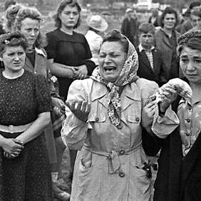 Kobiety opłakujące zmarłych – sceny żałoby i rozpaczy po pogromie,