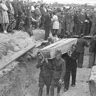 Tłum i kolumny pogrzebowe – kondukt żałobny, transport trumien i uczestnicy pogrzebu ofiar pogromu